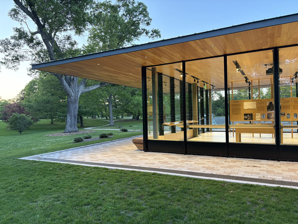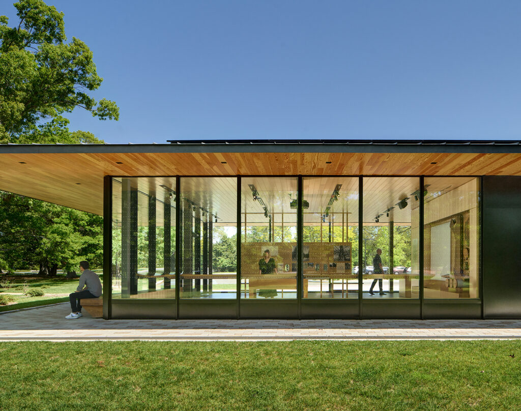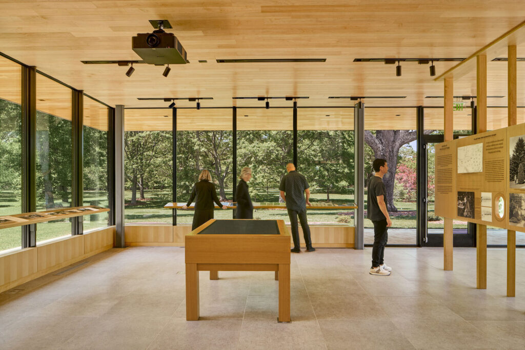 The new Visitor Center serves as a welcoming gateway to the Arboretum’s 650 acres of gardens and historic landscape. Designed as a light-filled glass pavilion, it invites visitors to explore interactive exhibits on trees and ecology while maintaining a seamless visual connection to the surrounding grounds. Daylight is maximized through expansive glazing, while the deep overhanging roof minimizes solar gain and glare. Integrated LED downlighting within the overhang provides soft illumination for the terrace and exterior graphic panels during evening and seasonal low-light hours. Inside, L-shaped gallery spaces feature vertical and horizontal exhibits illuminated by concealed linear lighting and low-voltage track recessed into the warm wood-slatted ceiling. Adjustable heads deliver both accent and ambient light, creating an inviting environment that celebrates nature, craftsmanship, and education.